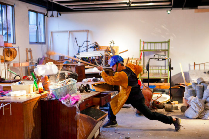 史金淞首先進行的是日常傳統物件的考據,並且將這些老舊家具匯聚一處,讓一群民眾戴著頭盔、護目鏡和防護衣,用力雜碎現場200多件舊物,幾乎像是文革時期紅衛兵「破四舊,立四新」狠勁,但史金淞說:「透過藝術暴動計畫,不僅能將物件實體的功能破壞,也使暴動者消解自身對知識的記憶,當一切歸零,物質才有進入其他流通體系的機會。」