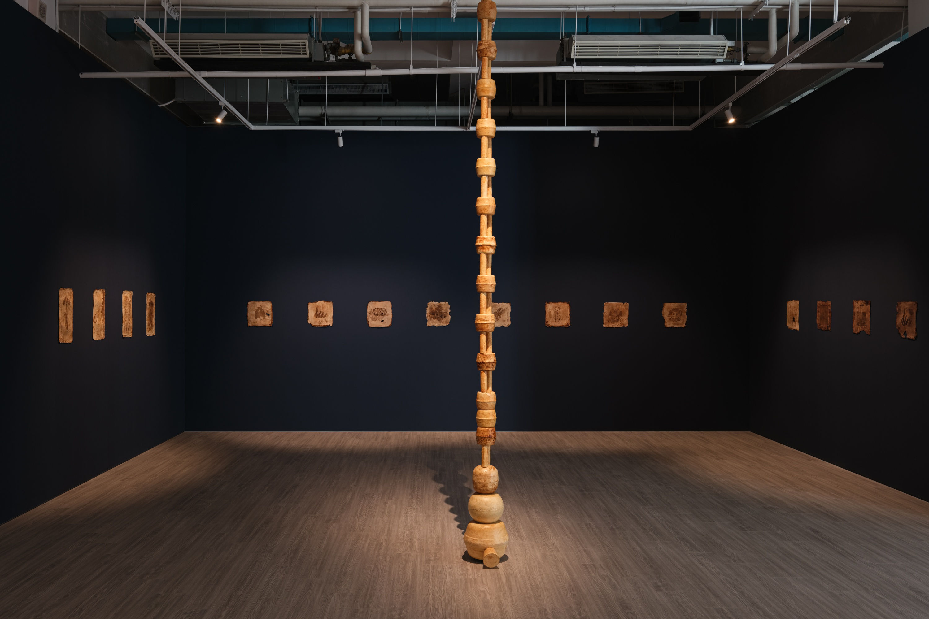 這次展出的作品包含若千種不同形式的造形表現。在裝置與雷射版畫等不同系列的基礎材料中,Tepu採用的方法,是以生物體為創作媒介,將菌絲體與木屑膠合、晾乾、塗層,讓生物體停止生長,其製成品一方面成為此次一組懸掛柱狀裝置作品的基礎結構;另一方面,類似原料也可進—步加工成新的生物複合材料「菌絲皮革」,近年來有不少以此為材料來製作日用品的工業應用,Tepu則將雷射版畫技術結合這種菌絲皮革,創造出此次展出的—系列「印刻」作品。生命結構在微觀與宏觀之間、在精細敏感與較大的體量和規模之間,牽引出跨越尺幅的張力與視野。