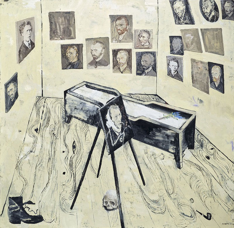《梵谷的房間與自畫像》,梵谷的自畫像至於畫面中央,X軸延伸出放滿梵谷從年少到死亡前之肖像的房間,並以靴子、鳶尾花和煙斗等象徵梵谷的物件妝點。(Photo Credit:安卓藝術)