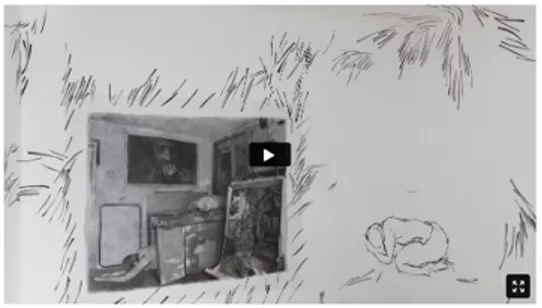 I loved this animation for the manner in which it addressed the questions that naturally appeared as I was discovering the artworks in the main room at first – how did the artist manage to climb up there as she was working on the two paintings featured in the exhibition or how are the plants that grace the studio being taken care of. What I also found incredibly interesting is that revealing some of the stages that go into her method in this manner did not make the character come across as the main focus – I saw it as a synergy between the artist and the environment she created and in which her practice thrives.