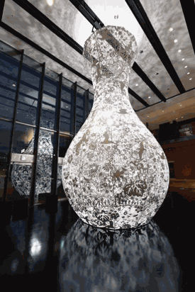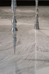 換言之,他所處理的塑形面對的是觀者的想像,這裡的想像關乎「生命發展」,也就是將「有機」的想像「感性化」,「刪除」倚賴身體的空間感,而進行細微的聚集與散置,讓即將消逝又彷彿滯留的複數痕跡在「簌聲」中會面:「迴響」。在104展間,他為台灣製作了《迴響 水晶計畫-福爾摩沙》,在作品形式上,將「漂浮」與「迴響」這兩個系列的形誌做了連結,甚至應該說,「交融」。如果將大卷的作品視為一種生態性雕塑,那麼,他不斷挑戰雕塑傳統的方式同時表現在物質、能量與形式之間的轉化,並在這轉化中鋪展出「層」的空間;也因此,筆者才會下了「風の光」的標題,因為「の」就像是一個「閾」(臨界)的時刻,一種話語中的「層」,彷彿說道穿過葉叢的風所帶出的聲音,能夠成為大卷期待我們看到的「內在」之光。